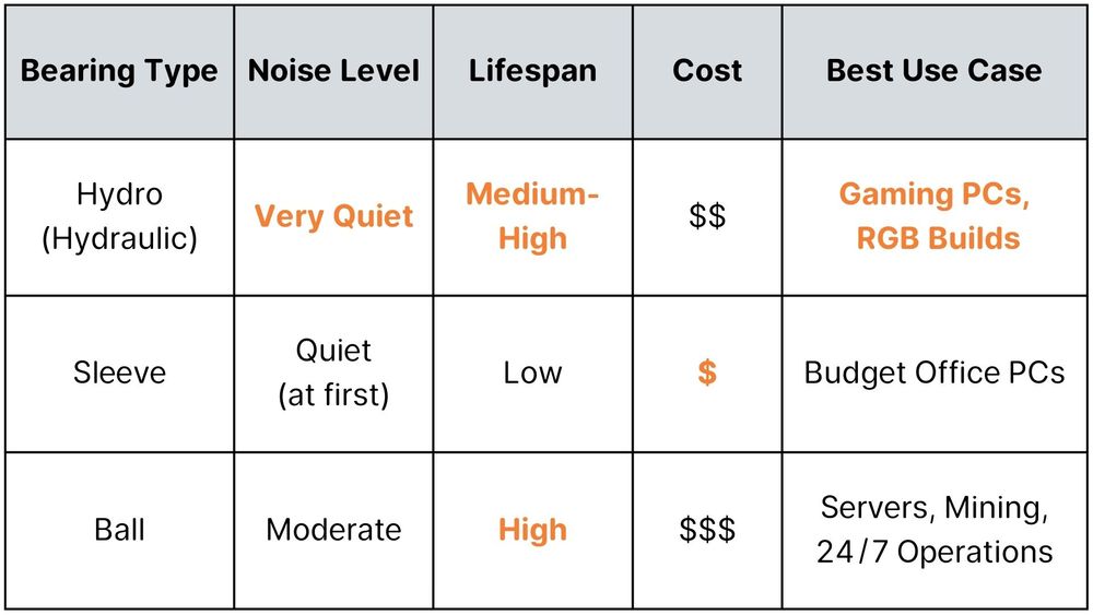 For most PC gamers and builders, Hydro (or Rifle) Bearing fans offer the best value. They provide the whisper-quiet operation you need for an immersive gaming experience while offering enough durability to outlast your other components.