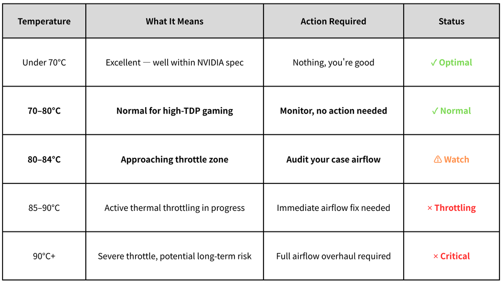 NVIDIA designs the RTX 5090 to operate within specific thermal ranges. Here's what the numbers actually mean for your build: