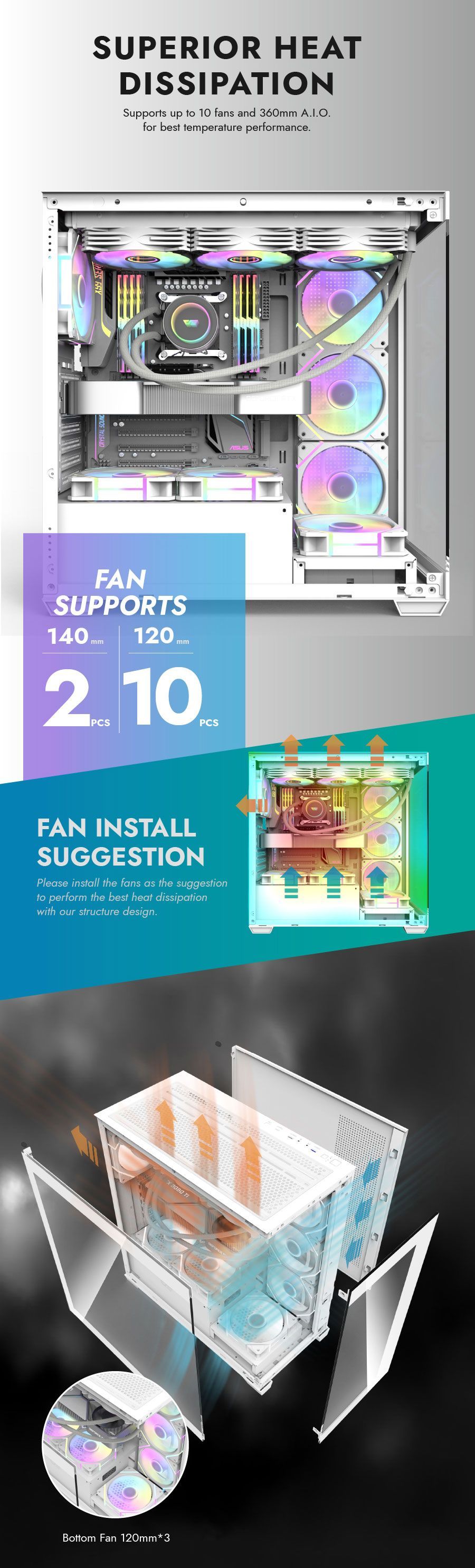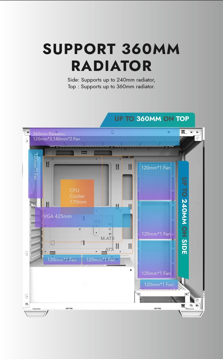 Support up to 10 fans and 360mm radiator